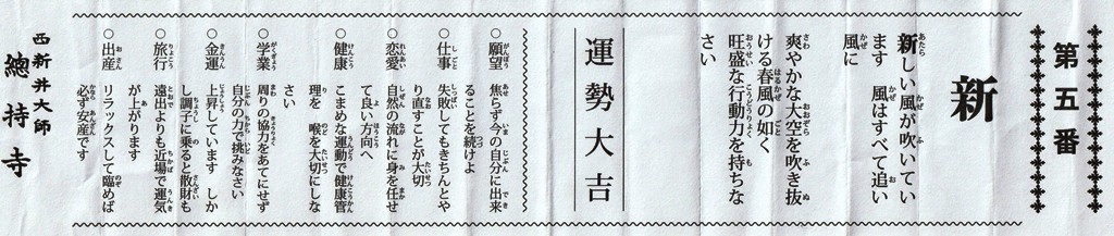 厄除け後は恒例のおみくじを引いた。他の場所ではおみくじを引くことはないが、西新井大師はおみくじの他にオマケで縁起物のお守りが付いているのだ。